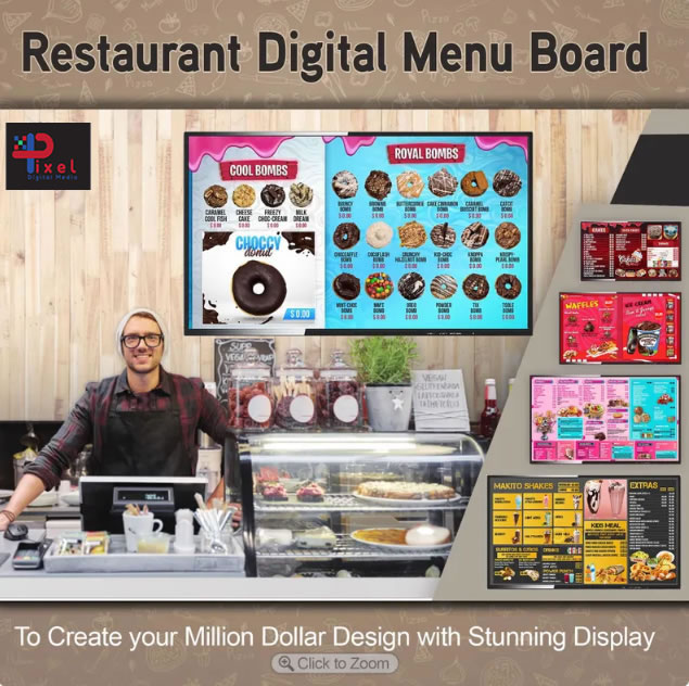Pixel Digital Media can design Your Menu board Gold Coast and Brisbane from Scratch or from your existing Menu turn it into a dynamic visual experience that will have your customer’s asking for more . we give you a fully editable menu no subscription no commitment .when you need to change the price you dont need us DO IT YOURSELF